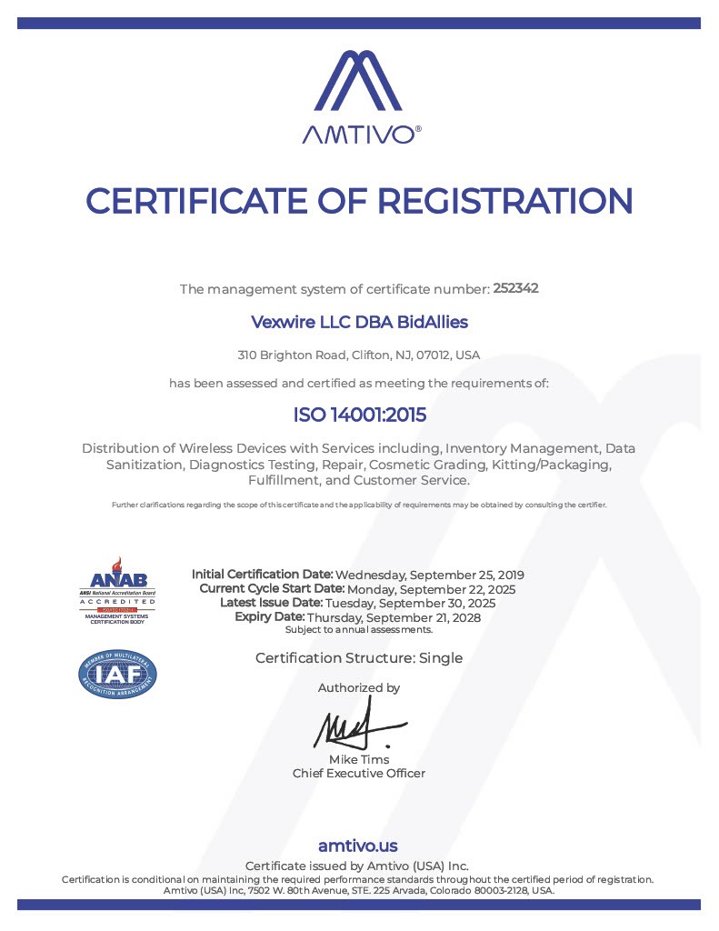 Our certifications are a statement of our ability to consistently meet and exceed employee occupational health and safety requirements, as well as requirements of responsible recycling practices, while also offering products that meet customer expectations and applicable statutory and regulatory requirements.