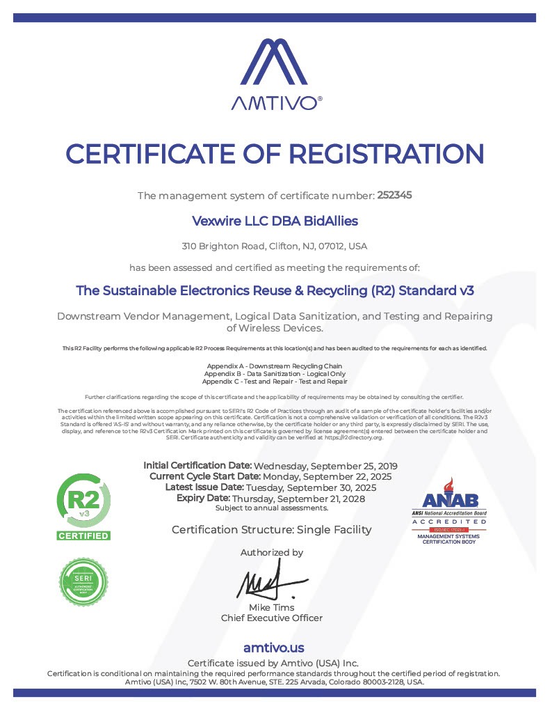 Vexwire holds ISO Certifications for Quality, Environmental, Health & Safety and the Sustainable Electronics Reuse & Recycling (R2) Standard.